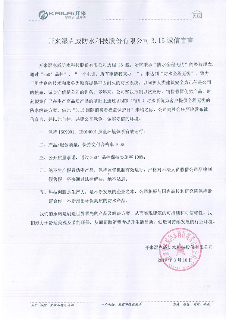 開來濕克威防水科技股份有限公司歷程26載,始終秉承“防水全程無憂”的經(jīng)營理念,通過“360°品控”、“一個(gè)電話,所有事情我來辦!”,來達(dá)到“防水全程無憂”。致力于用優(yōu)良的技術(shù)和服務(wù)為顧客提供牢固耐久的防水系統(tǒng)。以呵護(hù)人類建筑安全為己任是公司的使命,誠實(shí)守信是公司的訓(xùn)條,多年來,公司堅(jiān)決抵制以次充好,銷售假冒偽劣產(chǎn)品,時(shí)刻鞭策自己在生產(chǎn)高品質(zhì)產(chǎn)品的基礎(chǔ)上通過ARMOR(鎧甲)防水系統(tǒng)為客戶提供全程無憂的防水解決方案。借此“3.15國際消費(fèi)者權(quán)益保護(hù)日”來臨之際,公司向社會莊嚴(yán)地發(fā)布誠信宣言,并以此自律,共建公平競爭、誠實(shí)守信的環(huán)境。
