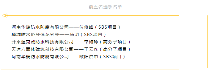 經過一天的激烈爭鋒,最后河南建筑防水協會會長陳寶貴發(fā)表講話并宣讀競賽結果:高分子項目第一名則是來自開來濕克威防水科技有限公司的李梅玲,吳志強榮獲高分子第三名的好成績,可喜可賀!期待他們在全國復賽中再次爭鋒,再創(chuàng)佳績!