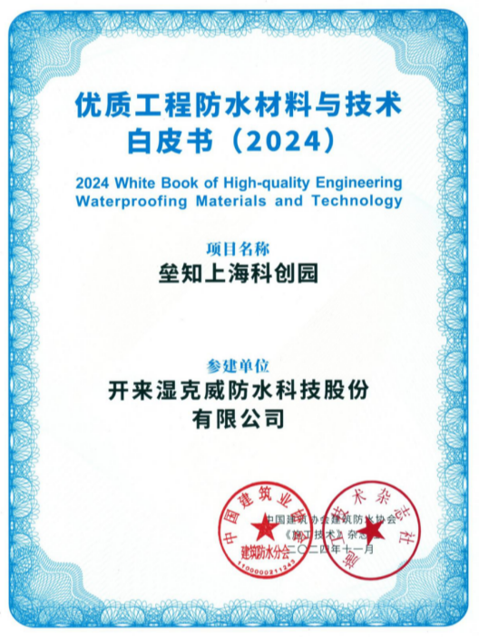 開來濕克威防水科技股份有限公司參建的壘知上??苿?chuàng)園項目入選《優(yōu)質(zhì)工程防水材料與技術(shù)》白皮書。